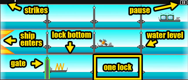 A new ships enters from the edges of the screen, heading towards the locks. Within a certain time, it will cross the tile it's in. When the ship reaches the end of the tile, it will try to cross over to the next tile, i.e. enter the adjacent water lock. If the water level in the adjacent lock matches the level in the ship's tile, the ship moves on safely. If water levels don't match, the ship sinks. This repeats in every tile: once a ship crosses a tile (within a certain time), it will try to enter the adjacent tile. A warning light on the ship's bow alerts to any danger. The game starts out easy, with one or more empty tiles, and a slower pace. As the levels get harder, the ships keep coming at a faster pace.